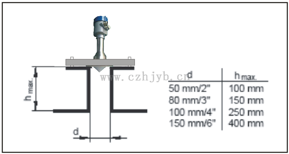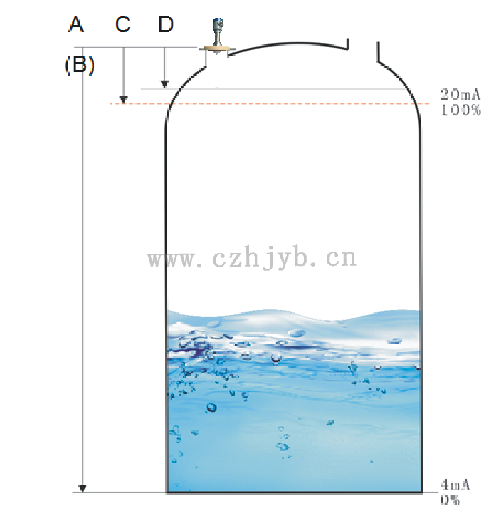 注:使用雷達(dá)物位計(jì)時(shí),務(wù)必保證最高料位不能進(jìn)入測量盲區(qū)(圖中D所示區(qū)域)。